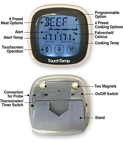 INTERNAL MEAT THERMOMETER with Large 2.25" illuminated electronic digital instant read LCD TOUCH SCREEN display used as a KITCHEN OVEN, GRILLING and BBQ THERMOMETER