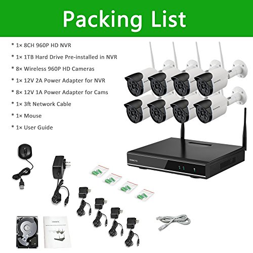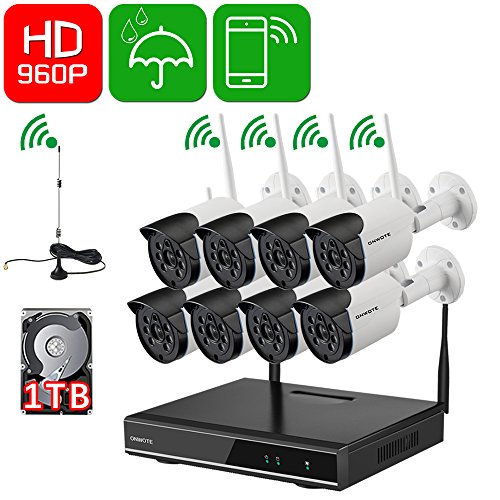 ONWOTE 8 Channel HD Wireless WiFi IP Security Camera System with 1TB Hard Drive and 8 Outdoor Night Vision 960P 1.3 Megapixel Wireless Cameras (1080P Output, Built-in Router, Auto-Pair, Motion Alert)