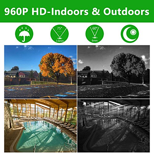 【960P HD Video Day & Night, Indoors & Outdoors】-- See in stunning clarity and sharper details with 1.3 Megapixel (1280*960) cameras. With 6 LED arrays, IR night vision up to 80ft. Employing IP 66 weatherproof aluminum housing material, cameras can be used indoors and outdoors.