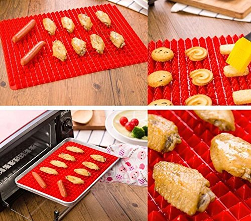 2 Pack Perfect Kitchen Mat --- Now you can make your food more crisp, juicy. All you have to do is put your food on this raised cone shaped pan while baking then watch the fat and oil drips away from the food, avoiding it from sticking to the baking tray.