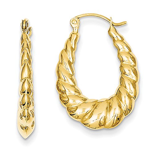 Elevate your everyday style with the innovative twisted design of these polished 14k yellow gold hollow hoop earrings. They are approximately 2-3mm (1/8 inch) in thickness, 18mm (11/16 inch) in width by 25mm (1 inch) in length.Feature