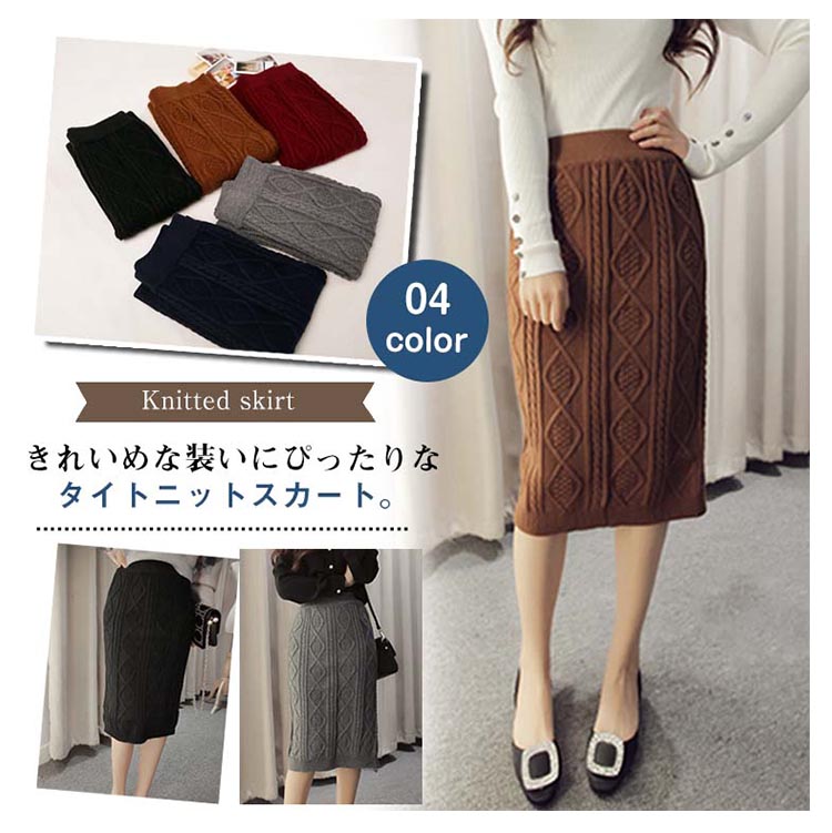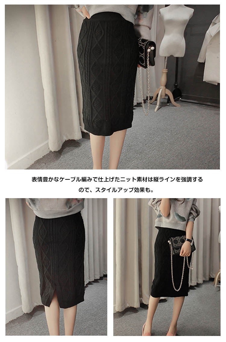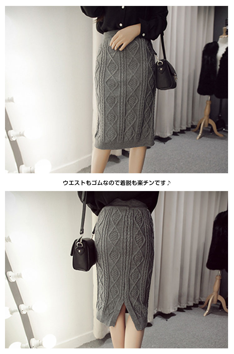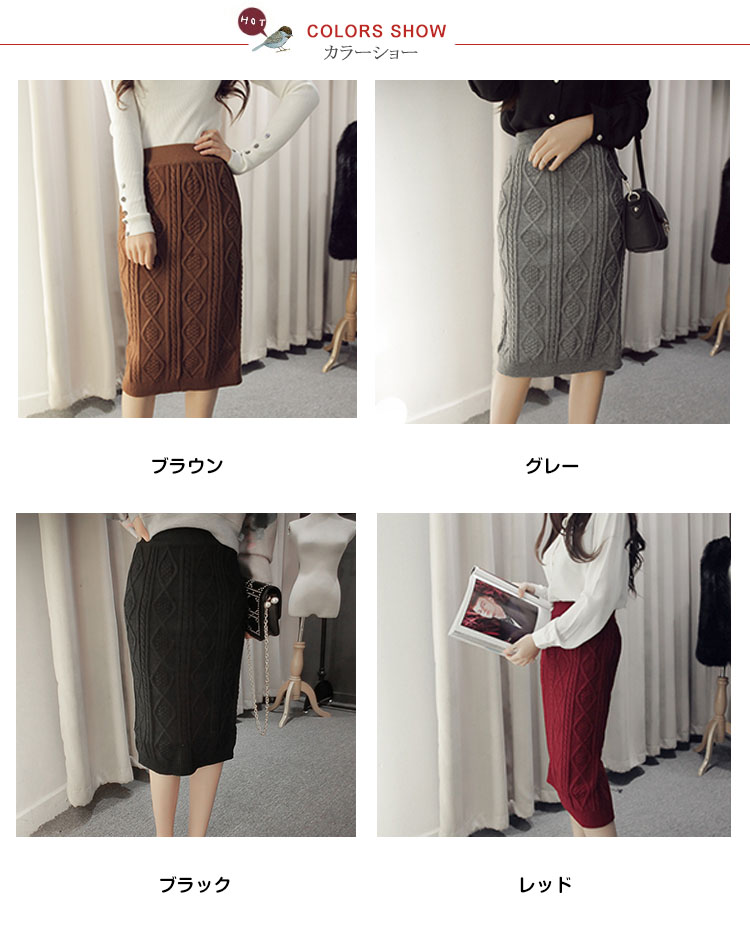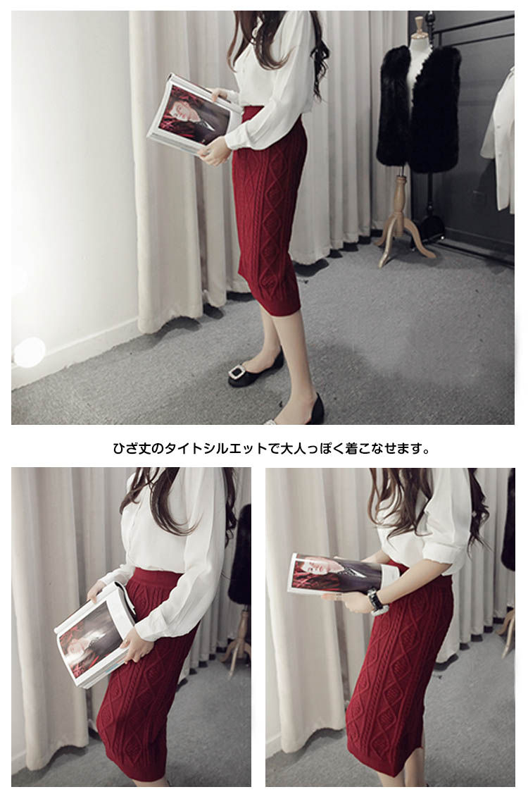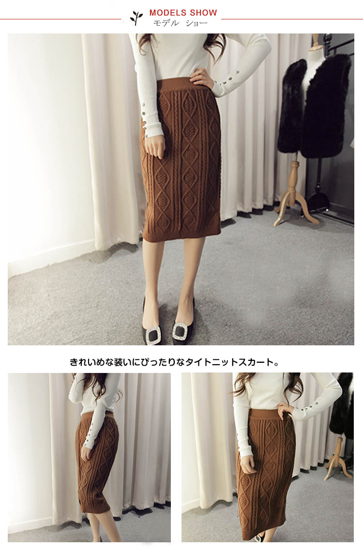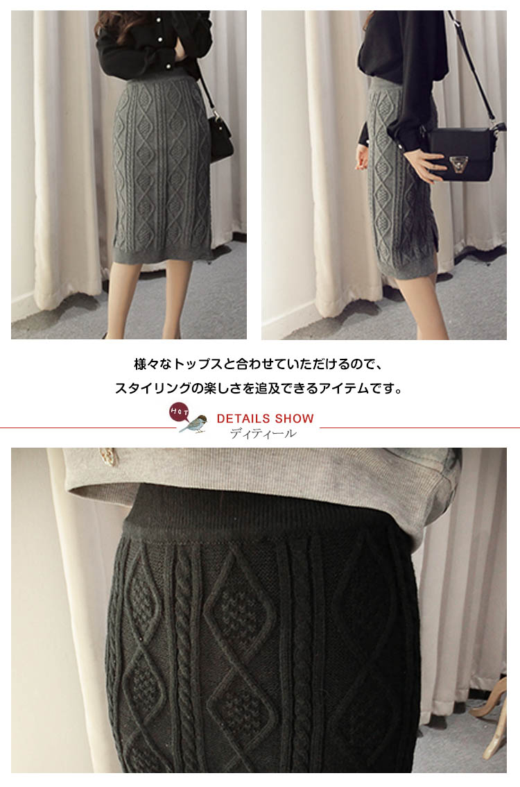 | きれいめな装いにぴったりなタイトニットスカート。ひざ丈のタイトシルエットで大人っぽく着こなせます。表情豊かなケーブル編みで仕上げたニット素材は縦ラインを強調するので、スタイルアップ効果も。ウエストもゴムなので着脱も楽チンです♪様々なトップスと合わせていただけるので、スタイリングの楽しさを追及できるアイテムです。 | |