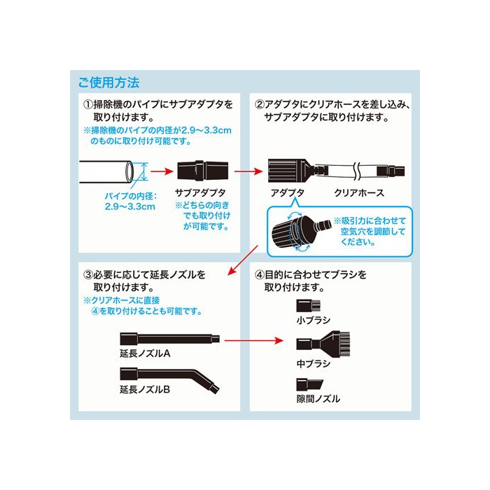 <사양>■세트 내용:클리어 호스(약90cm)×1,어댑터×2,노즐×3,브러시×2■적응 사이즈:청소기의 안쪽 치수2.9~3.3cm의 것에 사용으로 옵니다.※업무용,핸디 타입,해외 메이커인 것에는 사용 주실 수 없는 경우가 있습니다.