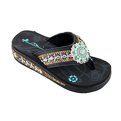 Product Description These Montana West flip flops have a floral concho with turquoise and rhinestones, and a floral design with the Montana West logo on the top of the sole and a 1.75 inch wedge. 0