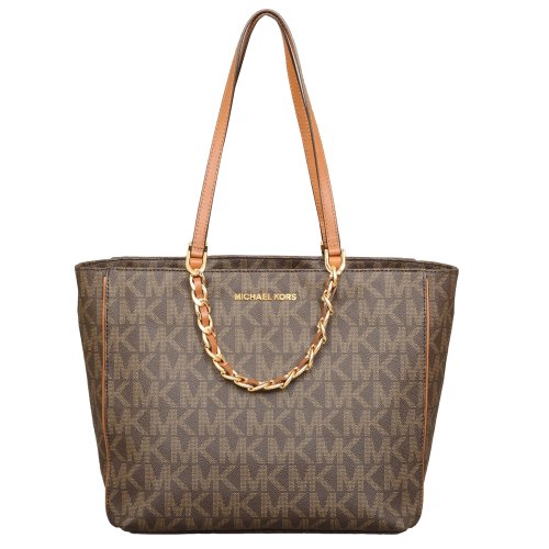 -. Brand : MICHAEL Michael Kors -. Color : Brown -. Department : womens -. EAN : 0736983876713 -. Feature : Made of MK Signature PVC, Brown leather trim and Gold hardware / Gold chains with interwoven leather hang off front and back / Double flat leather handles - Magnetic snap closure / Five interior pockets, key leash, and padded center zip pocket for iPad or tablet / 11.75"W x 10.5"H x 5"D - Drop = 10" -. ProductGroup : Shoes -. ProductTypeName : HANDBAG -. Title : MICHAEL Michael Kors Large Harper E/W Tote in Brown -. UPC : 736983876713