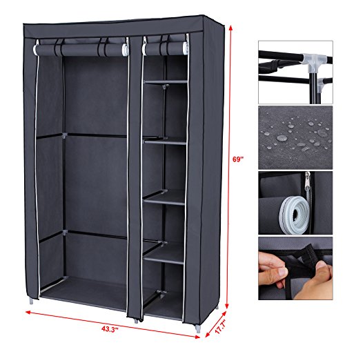 - Feature : Keeps your clothes, shoes un-viewable, away from dust and your room pretty neat; / Selected non-woven fabric cover, water-proof fabric tiers; / Strengthened frame, steady and sturdy when fully assembled; / Movable clothes hanging rod and 6 storage shelves; / Product Dimension (WXDXH): 43.3" x 17.7" x 69"(110 x 45 x 175 cm).