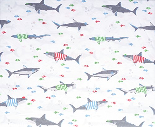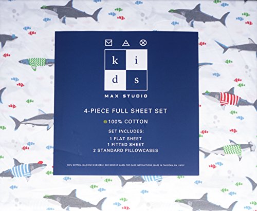 Max Studio Kids 4 Piece Kids Full Sheet Set Cute Great White Sharks with Striped Shirts