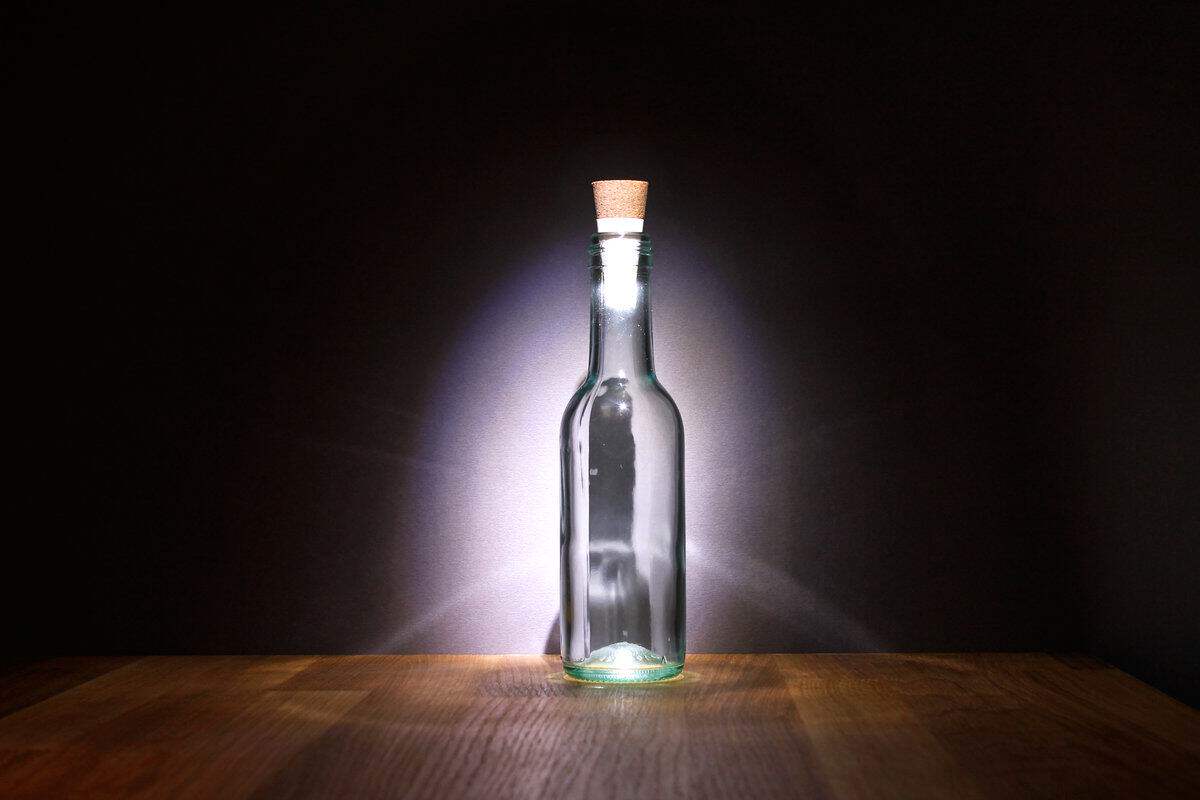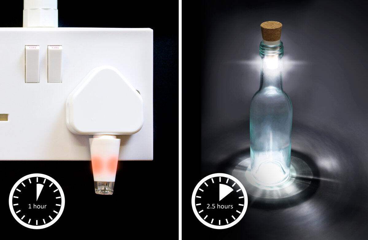软木塞底部配备一只电池驱动的LED灯。扭一下瓶塞让LED灯发光,然后盖在葡萄酒瓶瓶口,瓶子就像灯泡一样发光了.如果LED灯没电了,可直接将灯从木塞上拔下来,上面带有USB接口,直接充电即可. 虽然软木塞灯亮度不高,放进玻璃瓶里能够增加光照效果。