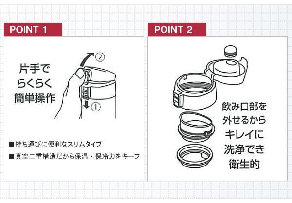 | 片手でラクラクに開ける事ができる、直飲みタイプの水筒です。保温と保冷、どちらにも対応しています。 |