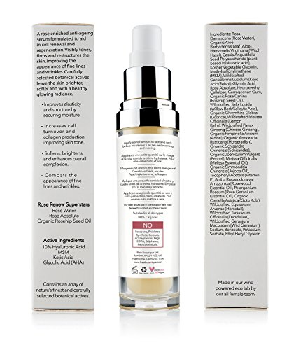 -. Feature : NATURAL & ORGANIC SOLUTION FOR THE BEST ANTI AGING SERUM - Baie Botanique presents Innovative, Botanical, Skincare made from the finest Natural and Organic Ingredients. Our delicately balanced formula contains pure raw materials no harmful chemicals, bleaches, or adulterated ingredients. All of our active ingredients are 100% plant and mineral derived, giving you a 98% Natural & 70% Organic experience. These all natural extracts combine to give you the best face serum available. Delight in Natural Rose Fragrances derived from key essential oils. Try risk free with our 30 day money back guarantee. / 10% HYALURONIC ACID ANTI WRINKLE SERUM, WITH ALL NATURAL EXTRACTS - Hyaluronic Acid, a naturally occurring and powerful moisture-binding ingredient, dramatically boosts the skin's own hydration levels, helping to maintain skin's elasticity and youthful radiance. Hyaluronic acid serums have been proven to smooth fine lines and wrinkles, rejuvenate aging skin while eliminating unsightly wrinkles, all while generating renewed evenness and elasticity to bring a fresh and healthy glow to your complexion. Our facial serum also contains highly enriching extracts such as Rosewater, Rose Absolute and Rosehip Seed Oil. Each of these targeted extracts are well documented for their highly regenerative, restorative, healing and moisturising properties. / CRUELTY FREE DELICATELY NATURAL SKINCARE - Our anti ageing serum is vegan certified and cruelty free. No animal testing, or unethical practices go into our manufacturing process. This delicate, all natural approach creates the best anti aging serum ideal for all skin types. Baie Botanique is committed to providing you with products containing no potential irritants. All our products are 100% free of Parabens, Phthalates, Propylene Glycol, Synthetic Colours or Fragrances, PEGS, EDTA, Sulphates, and Petrochemicals.