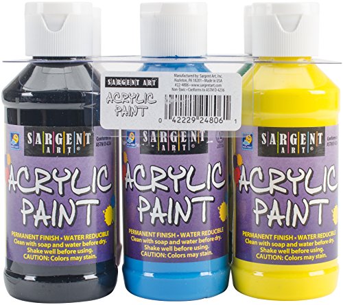 Sargent Art acrylic paints can be used for variety of painting techniques. Opaque colors combined with permanent coverage makes this paint applicable for all surfaces and project. Non-toxic and conforms to ASTM D 4236. Clear bottles with white flip caps. Primary 6 pack includes Yellow, Red, Turquoise Blue, Green, Black and White.Feature