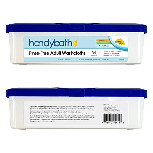 Studio : Diamond Wipes Publisher : Diamond Wipes Binding : Health and Beauty Product Description Extra Large Adult Washcloths HandyBath® Extra Large Adult Washcloths provide extra body coverage with every wipe. They're a great alternative to traditional bathing when caring for others or for personal rinse-free cleansing on the go. Each 12" x 9" wipe is specially formulated for the gentlest refreshing clean and is convenient to carry for any outdoor/indoor occasion. 0
