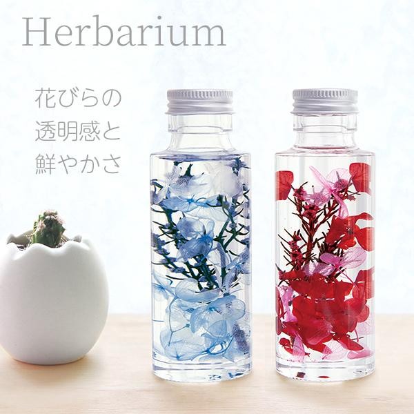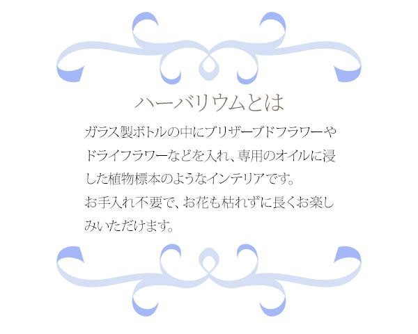ハーバリウムとはガラス製ボトルの中に天然素材のお花や植物を入れ、専用のオイルに浸した観賞用のインテリアです。お手入れ不要で長くお楽しみ頂けます。 |