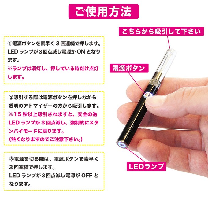 | 操作方法 | 【リキッド注入】 ・アトマイザーを回して本体から外します。 ・アトマイザーを逆さにして、コイルユニットを外します ・外れたら、真ん中の通気口に入らないように脇からガラスに沿ってリキッドを流し込みます。 ※コイルが緩んでいる可能性があるので念の為締め直して下さい。 ※リキッドがコイルに染み込むまで約20分ほど時間を置いてから通電させてください。 【電源の入れ方】 ・ボタンを素早く3回連続でクリックするとライトが点滅し電源が入ります。 ・ボタンを押している間通電します、吸っている間はボタンを押しっぱなしでご使用ください。 ・再度、ボタンを素早く3回連続でクリックすると電源がオフになります。 |