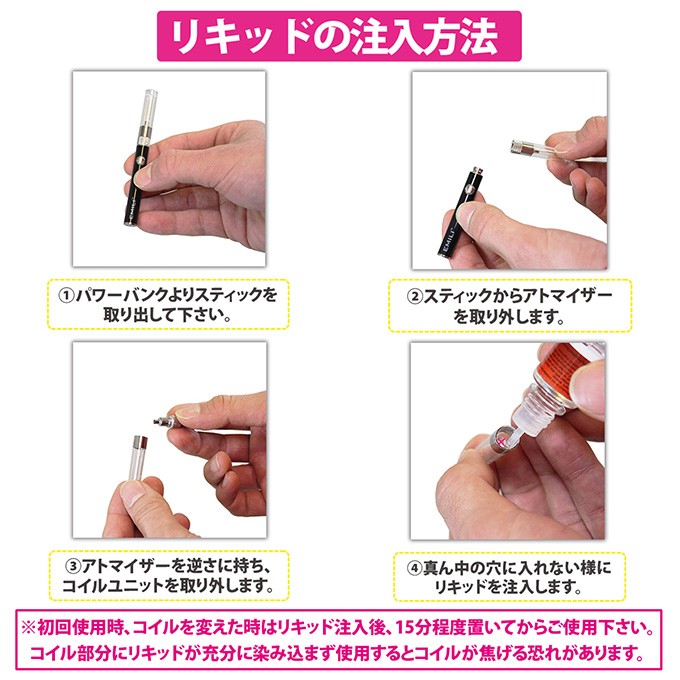 | リキッド注入時のご注意 | リキッドを注入後にコイル部品に染み込まない段階で吸引しますとコイルの焦げにつながります。リキッド注入後は20分程置いてからご使用ください。 |