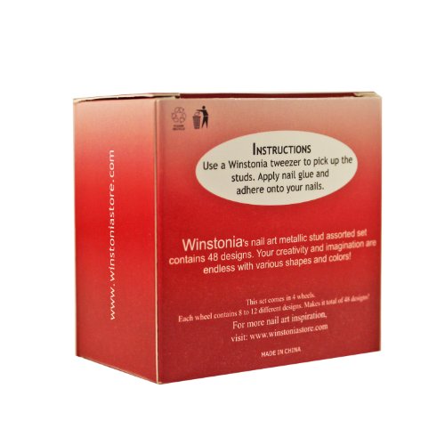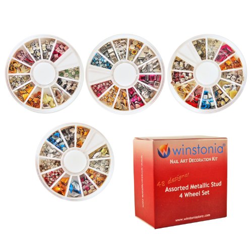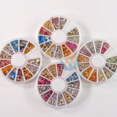 3D metallic nail art is hot! Grab our newest metallic stud bundle set to catch up the trend. The set comes in 4 wheel with 12 compartments each, each compartment stores different shape and color of nail art stud, makes it a total of 48 shapes/colors!Various sizes and shapes to create one of a kind nail art. There are so many that you won't be running out of studs in a while! Note: the studs are reusable when remove properly.