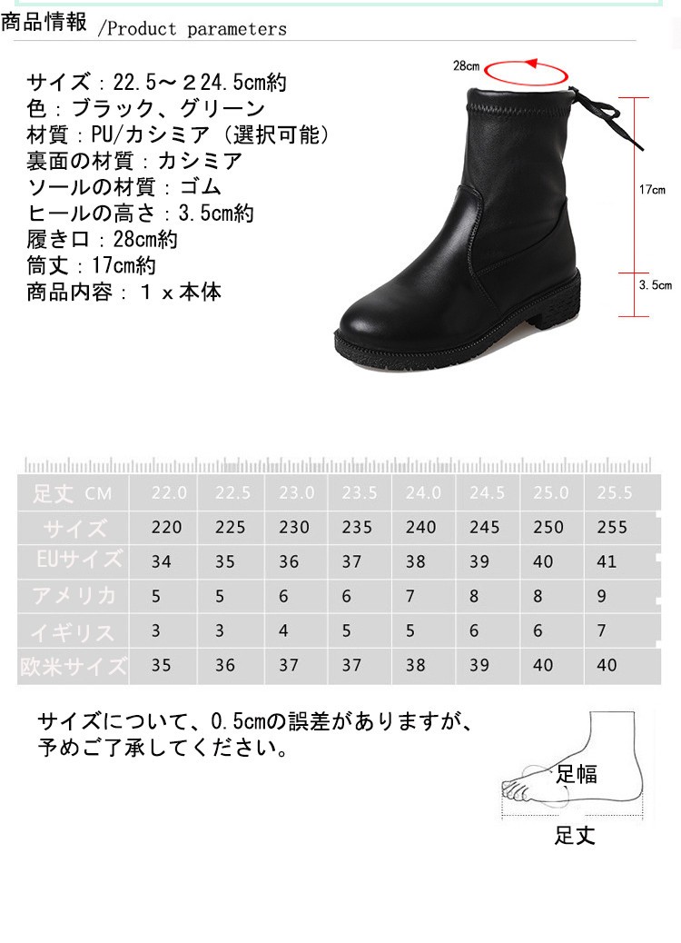 裏面の材質:快適な材質 表面の材質:PU色:ブラック、レッド ソールの材質:ゴムヒールの高さ:8cm約サイズ:22.5~24.5cm約商品内容:1x靴サイズ:34:22cm 35:22.5cm 36:23cm 37:23.5cm 38:24cm 39:24.5cm 40:25cmショートブーツレディース ヒール 女性のアンクルブーツ シューズ ファスナー式靴 秋冬物 シンプル くつレディース用のアンクルブーツが登場ハイヒールの靴なので、美脚ですカラーもシルエットもとても組み合わせしやすくて、どんな場合にも使える上品な一足