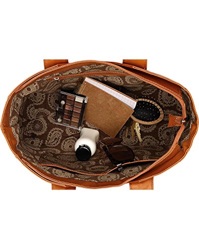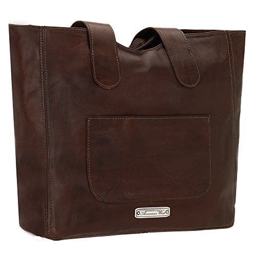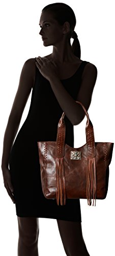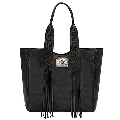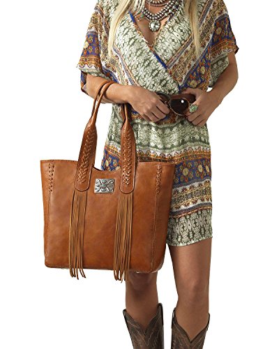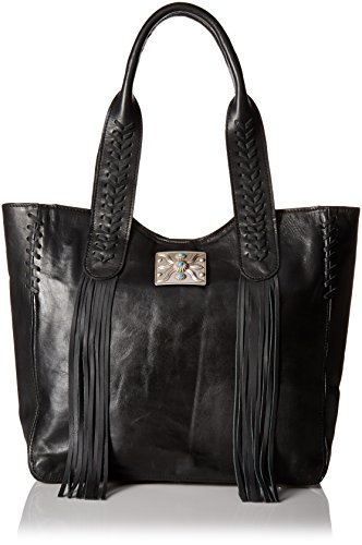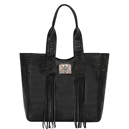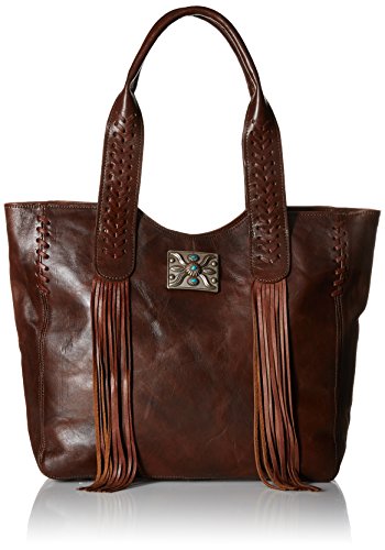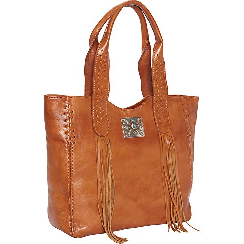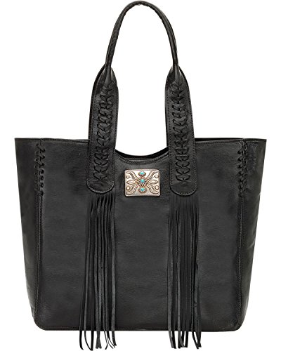 Studio : American West Publisher : American West Product Description Some purses are absolutely created to make a bold statement, and this American West Mojave Canyon Large Zip Top Tote certainly does that and more. This stunning bag is crafted from genuine vegetable tanned leather, and is decorated with leather lacing and accented with soft flowing fringe, plus an pawn-style inspired silver concho with turquoise stones completes the look. This striking bag also offers a zipper pocket and open pouches inside with a cell phone pocket on back. You'll be a star of western fashion anywhere you go with this American West bag. 0