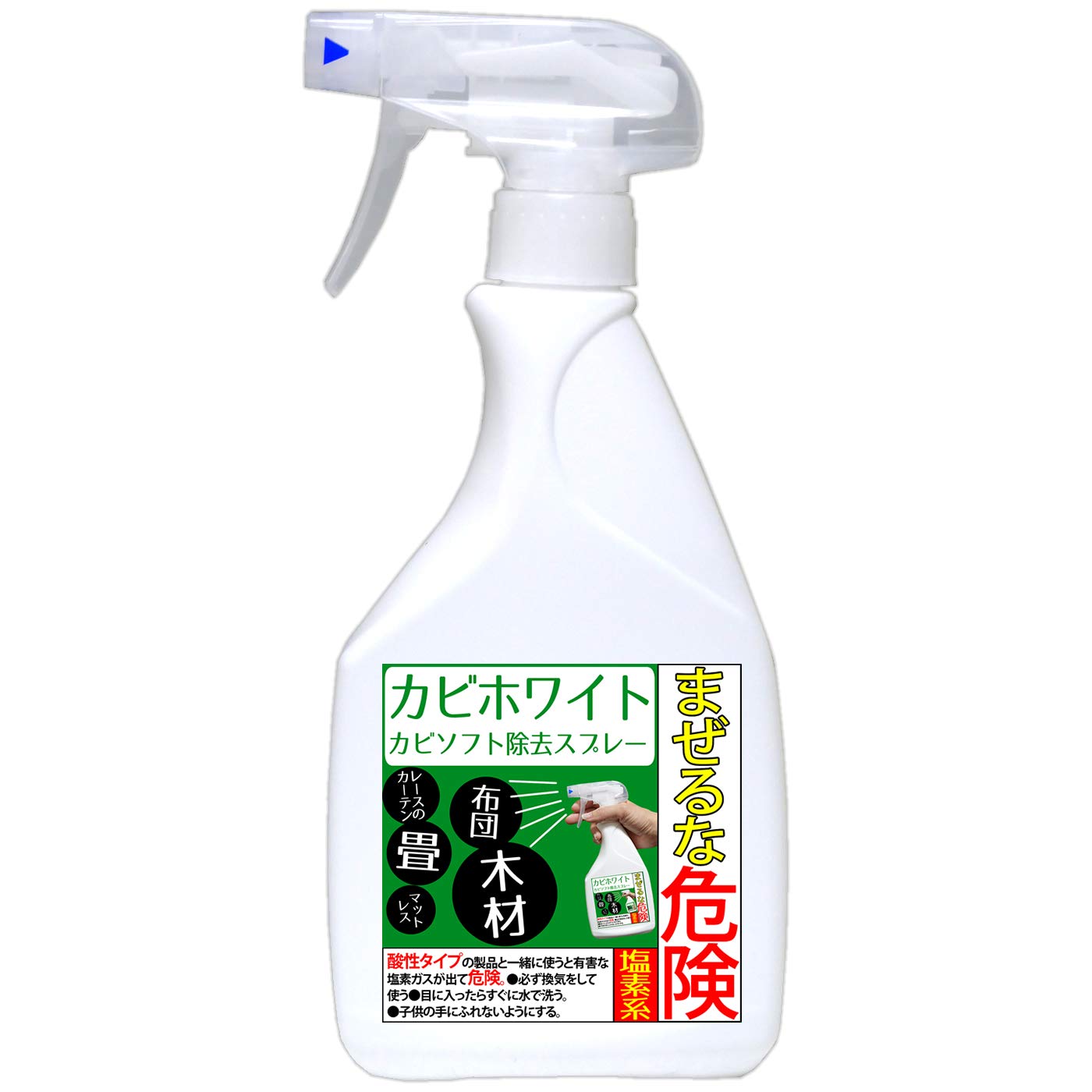 <実際のカビ取り方法について>●木材のカビにまんべんなくスプレーしてください。事前に濡らしたり拭きそうじも不要です。カビの胞子が飛び散り他のところまでカビが生える原因になるので薬剤を直接スプレーしてください。ビショビショになるほどかけると塩素臭が消えにくくなるのでざっと湿る程度で十分に効果があります。スプレーしたら30分放置してください。まだカビが残っていたらその部分だけもう一度スプレーして30分放置してください。30年物のカビでもこの作業を2~4回程度繰り返せば徐々に取れて行きます。カビが消えたらざっと水拭きして乾燥させてください。