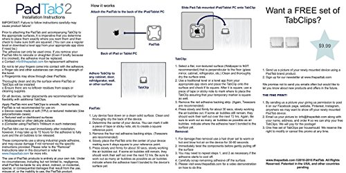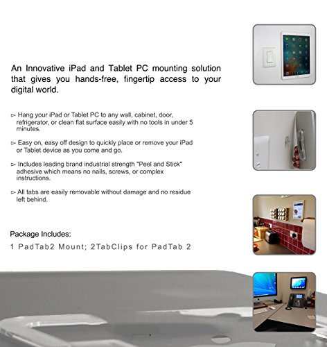 PadTab 2 (Now 40% Thinner!) gives you hands-free, fingertip access to your digital world. The PadTab 2 is thin and clear. TabClips can be applied to walls, cabinets, doors, refrigerators, and other surfaces w/o the need to drill, and can be painted to color-match the wall surface. Why PadTab? PadTab 2 can be installed without any tools using its industrial strength adhesive. It can also be attached directly to a Hard Shell Case for your Tablet instead of directly on your Device (Hard Plastic Only, No TPU). Best Value: The PadTab ships with two TabClips giving you the flexibility to mount your PadTab 2 in 2 separate locations. Additionally, the PadTab 2 allows you to mount in both landscape or portrait. Similar priced units force you to choose one or the other and do not accommodate multiple devices once mounted in only 1 location. Reliability: When installed correctly (ALWAYS Read the directions), the PadTab 2 is a safe, affordable and easy way to mount your device. The Original PadTab launched in the fall of 2010 and was a Top 10 Gift recommendation for iPad owners in the Dec 2010 edition of PC Magazine. PadTab pioneered the Damage Free, No Tool Mounting Solution. Compatibility: The PadTab 2 is universal so that it will work with any generation iPad or a tablet with a smooth non-textured surface. The TabClips also work with our PadTab 2 Mini for smaller tablet and smartphone devices. (Note: PadTab 2 TabClips are not interchangeable with our first generation mounts. You must use PadTab 2 TabClips!) Order multiple TabClips for the kitchen, entryway, bathroom or any room where you need quick access to your device.