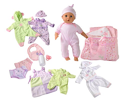COMPLETE COLLECTION: CP Toys Baby Doll Dress and Play Collection features everything your child will need for hours of nurturing pretend play! This 16” baby doll features multiple outfits, hats, a bottle, a pacifier, and even a pretty pink floral diaper bag to carry it all in!