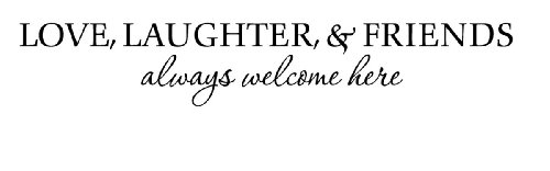 -. Binding : Kitchen -. Brand : WallDecalQuote -. Color : Black -. EAN : 0700358370526 -. Feature : Wall Decal Color: Black / Size: 28" Wide x 10" High / Made from 7 year High Quality outdoor/indoor vinyl / Can be used on wall or any other smooth surface / self adhesive wall decal - easy to setup -. IsAutographed : 0 -. Label : WallDecalQuote -. Manufacturer : WallDecalQuote -. Model : 6078357 -. MPN : V292 -. PartNumber : V292 -. ProductGroup : Home -. ProductTypeName : HOME -. Publisher : WallDecalQuote -. Size : 28" Wide x 10" High -. Studio : WallDecalQuote -. Title : Love Laughter Friend are always welcome wall quote wall decals wall decals quotes -. UPC : 700358370526