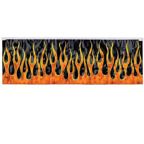 Studio : The Beistle Company Publisher : The Beistle Company Binding : Kitchen Product Description Beistle 55143 FR Metallic Flame Fringe Banner. Looking to add a hot decoration to your Halloween or chopper party? Try the metallic flame fringe banner! This 1-ply banner measures 14 Inch long by 4 feet wide and can be hung from ceilings, walls, or even around tables! Each banner is fringed and comes with flames printed against a black background on metallic material. 0