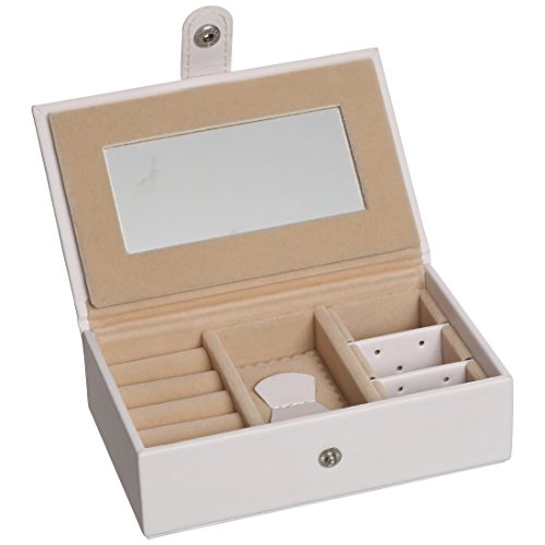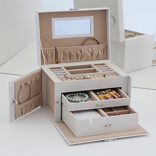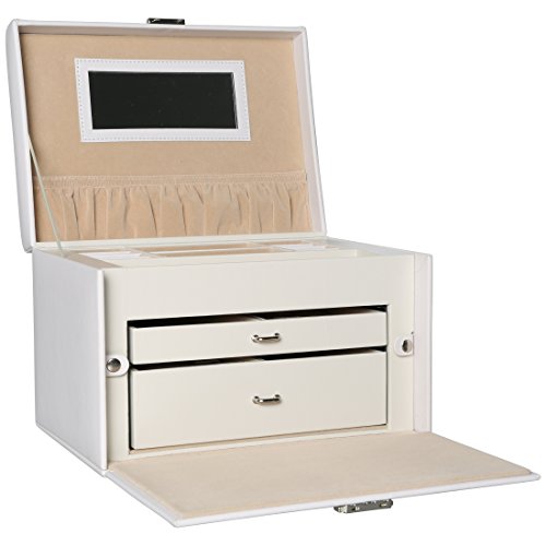 -. Feature : Großzügiger Schmuckkasten mit vielfältigen Aufbewahrungsmöglichkeiten und abschließbarem Metall-Verschluss - inkl. 2 Schlüsseln / In sorgfältiger Detailverarbeitung - außen mit hellem Kunstleder bezogen, innen mit samtig weichem Stoff / Zwei Schubladen, eine davon mit herausnehmbarem Extra-Schmuckkästchen mit Druckknopf / Zwei seitliche Klappen mit Haken und Schmuckfach / Maße: ca. 25,6 x 17,7 x 18,5 cm
