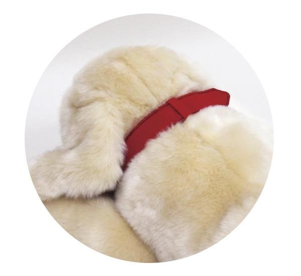 白いラブラドールレトリバーのぬいぐるみです。ふわふわの毛並みと赤い首輪がキュート♪