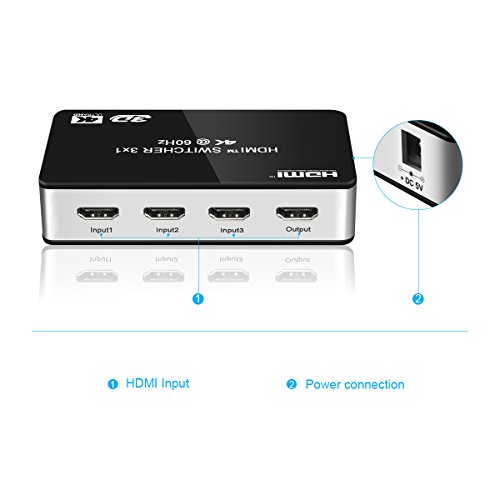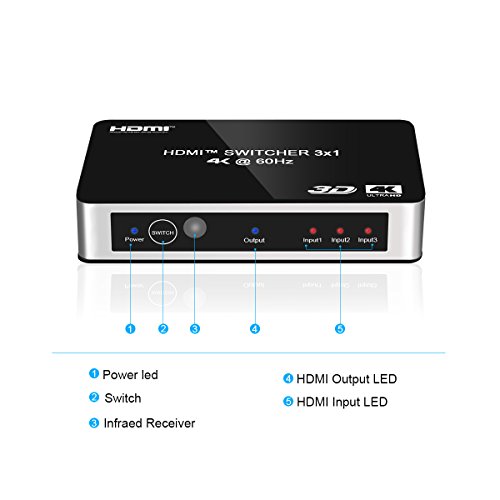 4K@60HZ HDMI Switcher, EPOLLO Premium 3 In 1 Out HDMI Switch with IR Wireless Remote And AC Power Adapter Supports Ultra HD Full 3D HDCP2.2 Ultra-Fast-Paced Play for PC,PS4,DVD Etc