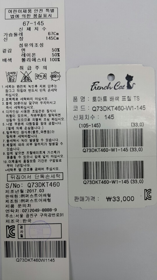 제조자 : 퍼스트어패럴