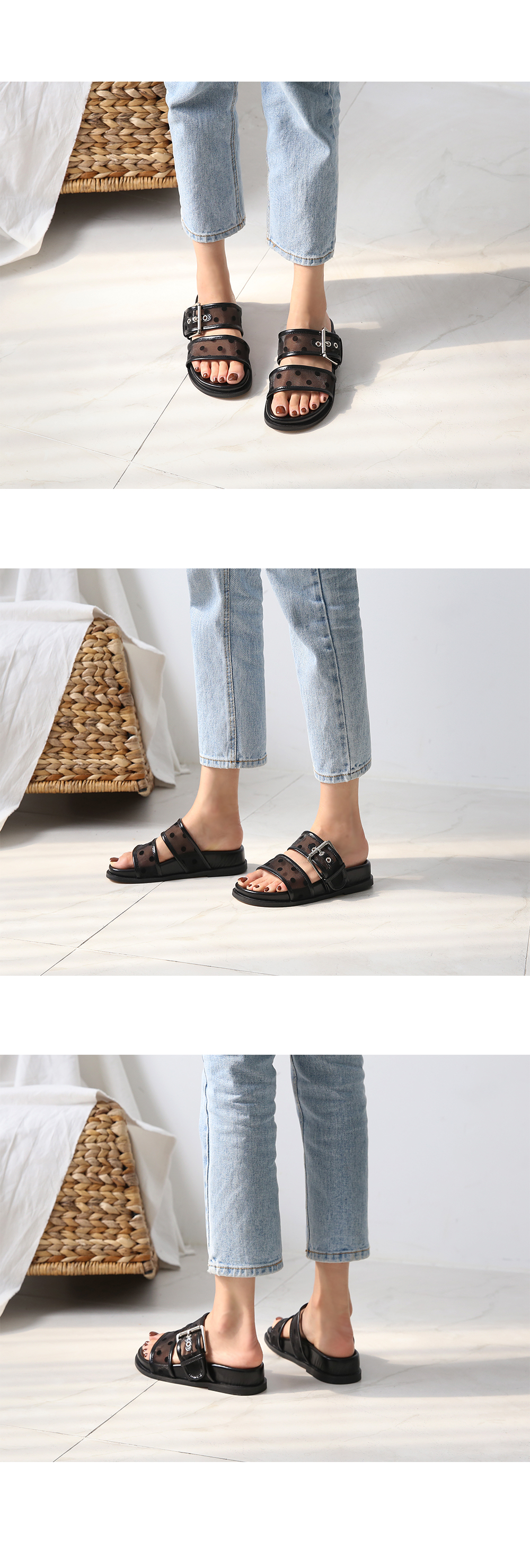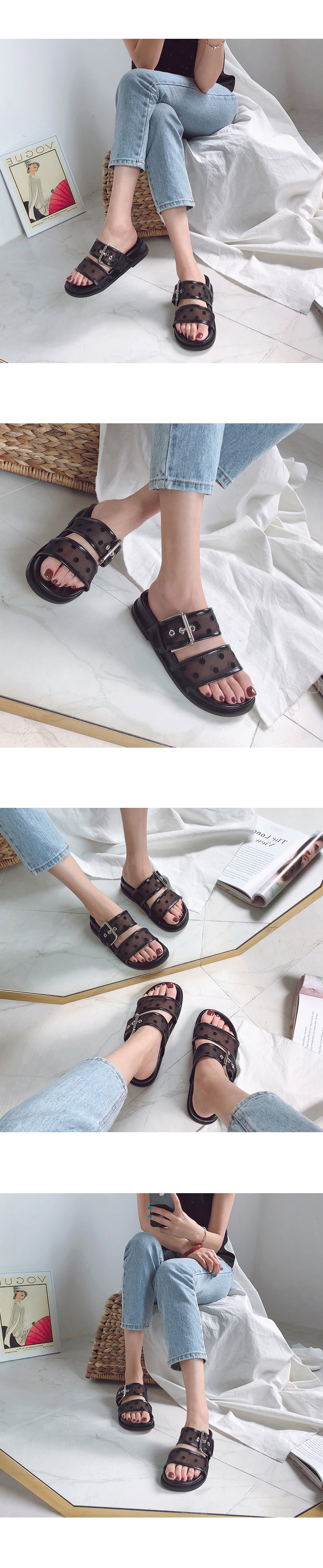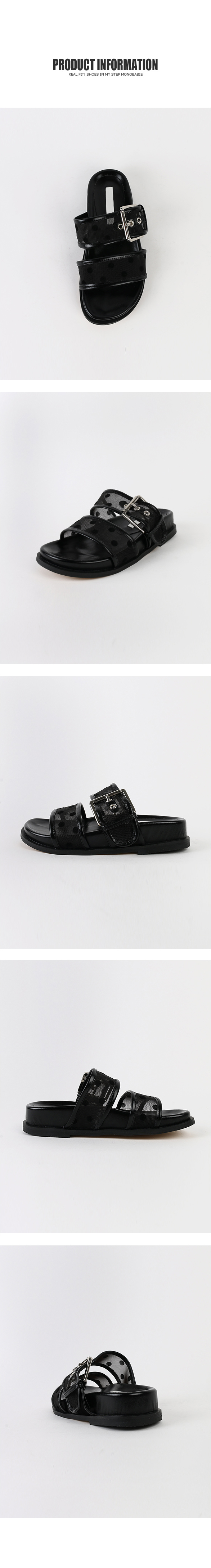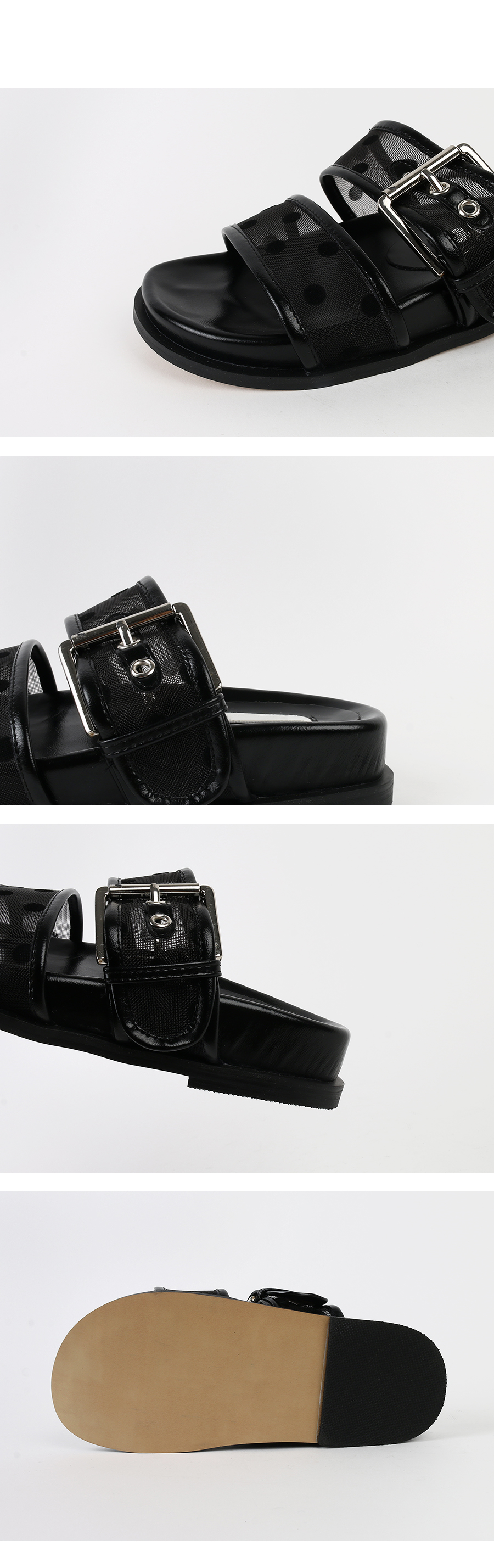 오동통한 디자인의 도트무늬 메쉬소재로 구성되어 있는 이중굽의 샌들입니다.