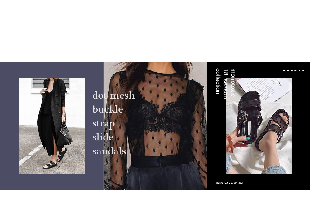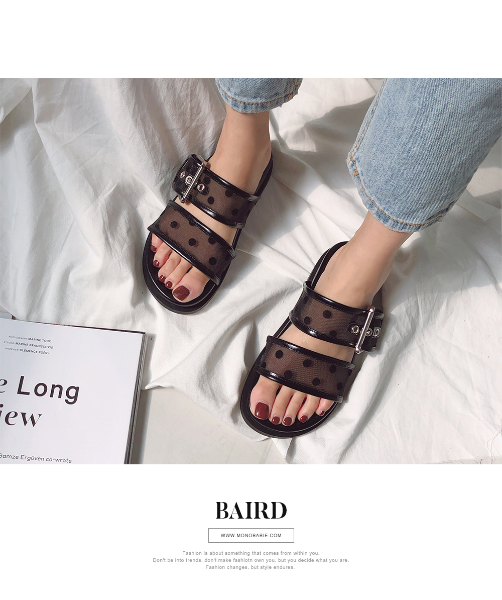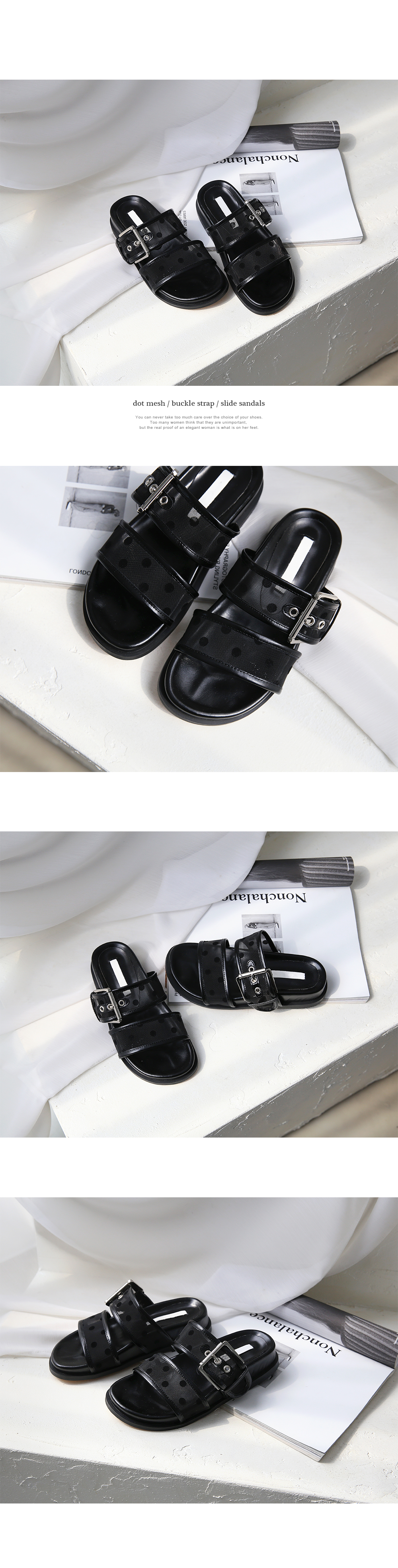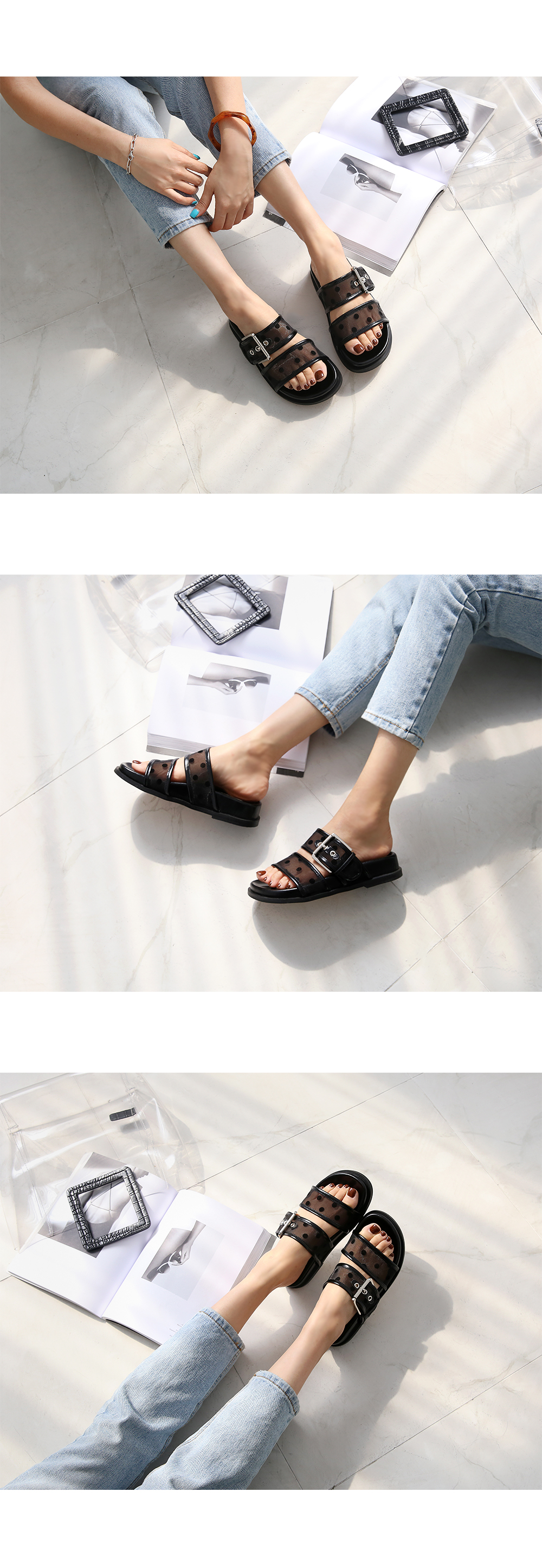 오동통한 디자인의 도트무늬 메쉬소재로 구성되어 있는 이중굽의 샌들입니다.