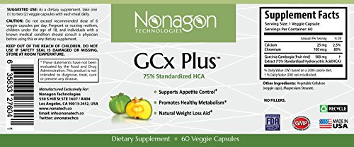 -. Binding : Health and Beauty -. EAN : 0635833276041 -. Feature : 75% Standardized Hydroxycitric Acid (HCA) / Supports Appetite Control / Promotes Healthy Metabolism / Natural Weight Loss Aid / Manufactured in a GMP-compliant FDA-inspected Facility -. Label : NonaTech -. LegalDisclaimer : These statements have not been evaluated by the Food and Drug Administration. These products are not intended to diagnose, treat, cure or prevent any disease. Consult your physician before beginning any supplement program.P.R.Ior to using these products, Download the Supplement Facts on this site, take them to your physician for approval. This product is different than supplements you may have tried and generally is more potent.DO NOT experiment with dosages. Take only as directed under the supervision of a medical professional. -. Manufacturer : NonaTech -. PackageQuantity : 1 -. ProductGroup : Health and Beauty -. ProductTypeName : HEALTH_PERSONAL_CARE -. Publisher : NonaTech -. Studio : NonaTech -. Title : NonaTech GCx Plus -. UPC : 635833276041
