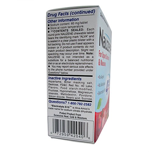 -. Feature : Prompt relief of upset stomach, including nausea / Quick dissolving, chewable tablet with delicious wild cherry flavor / Works in four minutes / Contains Electrolyte-S10 / No aspirin or salicylates