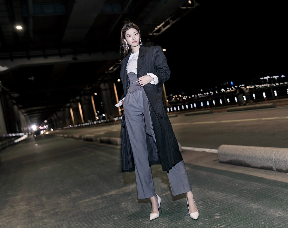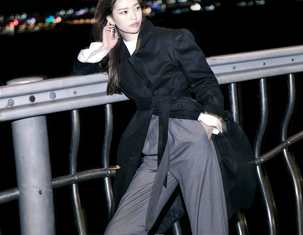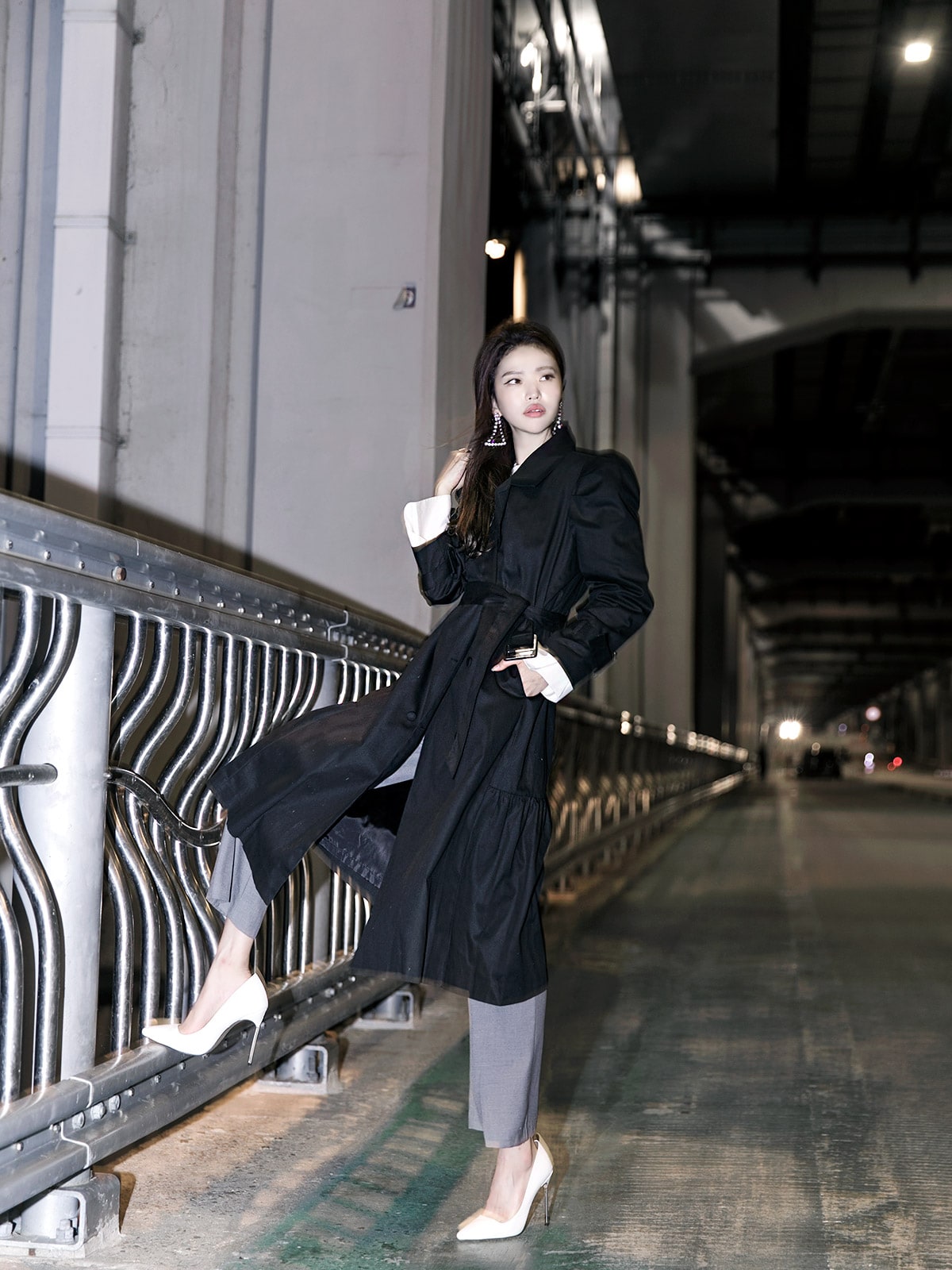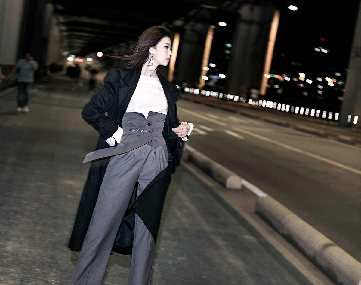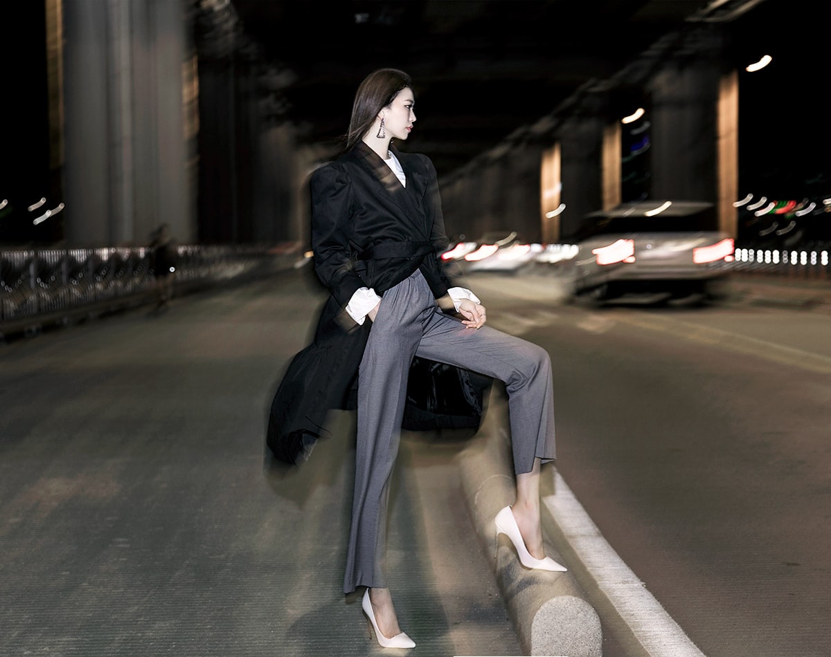 J-5011 모던 백 프릴 트렌치 코트(벨트set) Black