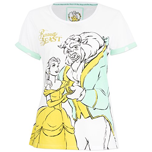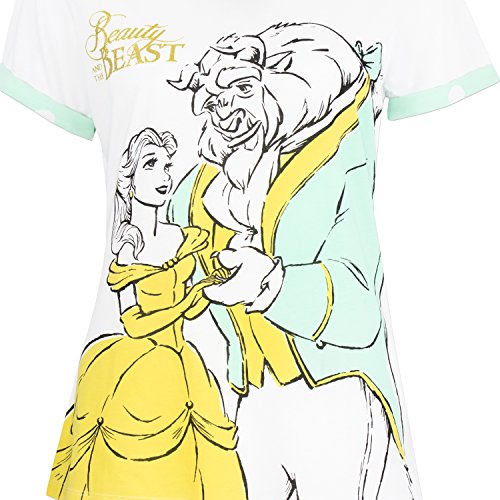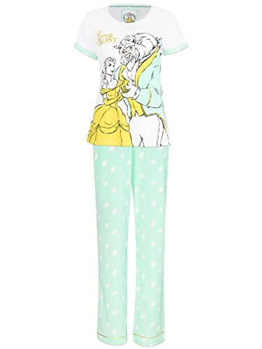 Womens Beauty & the Beast pajamas. Add a touch of magic to your nightwear with this gorgeous pajama set! These pretty pjs by Disney feature a sketch print of Belle and the Beast during their dance with coloured accents on their clothing, as well as the Beauty and the Beast logo in gold glitter detail. The pajama bottoms come with a white polka dot pattern against a vibrant teal and have gold piping on the ankles and a pretty bow on the waist. A look worthy of a ball every Disney Princess fan will love to wear!Feature