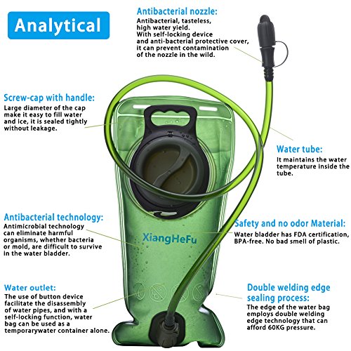 -. Title : Water Hydration Bladder Pack & Cleaning Kit,2 Liters,Tasteless,Wide-Opening,Leakproof Water Reservoir by XiangHeFu for Hiking Camping Backpack Bicycling