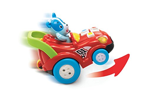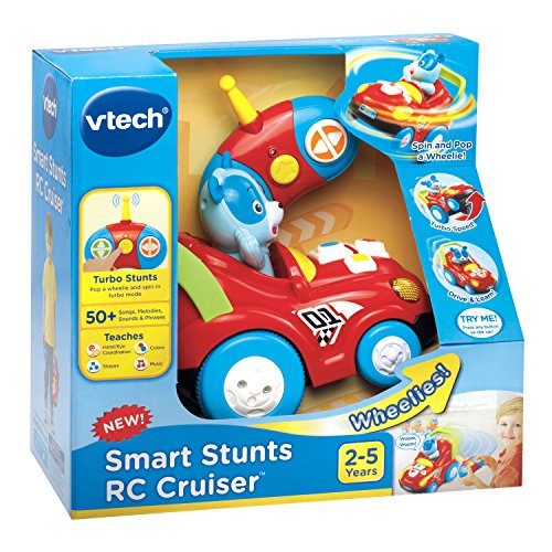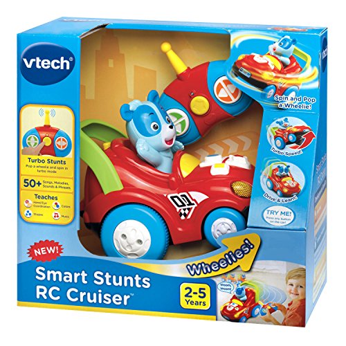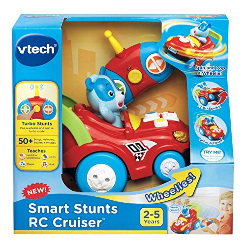 -. Binding : Toy -. Brand : VTech -. EAN : 3417761615003 -. Feature : Perform exciting tricks with the Smart Stunts RC Cruiser by VTech featuring the loveable Cody The Smart Cub; listen to fun cruising melodies / Features 2 cruising speeds, easy-to-use remote control and working headlights; 2 sing-along songs and 8 melodies / Colorful shape buttons provide fun educational content; introduces colors, shapes and simple traffic rules / Press the turbo button and the sporty RC race car gets a boost of speed, the music gets faster and Cody will perform exciting wheelies and spins / RC car toy is intended for kids 2 to 5 years old; car operates on 4 AA batteries that are included for demo purposes only, use new batteries for regular use; remote requires 2 AA batteries (not included) -. IsAdultProduct : 0 -. ItemPartNumber : 80-161500 -. Label : VTech -. Manufacturer : VTech -. Model : 80-161500 -. MPN : 80-161500 -. PackageQuantity : 1 -. PartNumber : 80-161500 -. ProductGroup : Toy -. ProductTypeName : TOYS_AND_GAMES -. Publisher : VTech -. Studio : VTech -. Title : VTech Smart Stunts RC Race Car -. Warranty : 90 day warranty against manufacturer defects