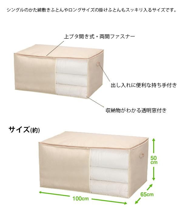 通気性のよい不織布を使用しているので、カビがつきにくく保存用に便利!ゴミやホコリをつけずに収納。 製造国:ベトナム 素材・材質:本体生地:ポリプロピレン不織布窓:ポリエチレン 商品サイズ:(約)100×65×50cm 仕様:【収納のめやす】シングル布団なら2~4枚 ※サプライヤー直送品 ご注文後3~4営業日後の出荷となります【商品名】STORAGE 収納用品 シューノ SN ふとん袋 ベージュ