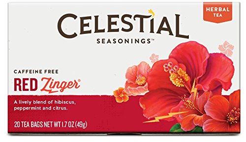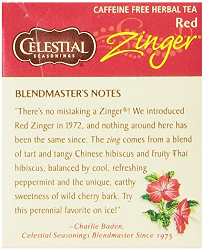 -. Binding : Grocery -. Brand : Celestial Seasonings -. EAN : 0070734000027 -. Feature : Case of six boxes, each box containing 20 tea bags (total of 120 tea bags) / Blend of hibiscus, wild rosehips, and lemon grass / Naturally caffeine-free; contains all-natural ingredients / Packaging features whimsical original artwork; stringless teabags help reduce waste / Ships in Certified Frustration-Free Packaging -. Label : Celestial Seasonings -. LegalDisclaimer : Actual product packaging and materials may contain more and/or different information than that shown on our Web site. We recommend that you do not solely rely on the information presented and that you always read labels, warnings, and directions before using or consuming a product. Content on this site is for reference purposes and is not intended to substitute for advice given by a physician, pharmacist, or other licensed health-care professional. You should not use this information as self-diagnosis or for treating a health problem or disease. Contact your health-care provider immediately if you suspect that you have a medical problem. Information and statements regarding dietary supplements have not been evaluated by the Food and Drug Administration and are not intended to diagnose, treat, cure, or prevent any disease or health condition. ABC Wholesale assumes no liability for inaccuracies or misstatements about products. -. Manufacturer : Celestial Seasonings -. Model : 48867 -. MPN : 48867 -. NumberOfItems : 6 -. PackageQuantity : 6 -. PartNumber : 48867 -. ProductGroup : Grocery -. ProductTypeName : GROCERY -. Publisher : Celestial Seasonings -. ReleaseDate : 2006-01-11 -. Size : 20 BAG -. Studio : Celestial Seasonings -. Title : Celestial Seasonings Red Zinger Tea, 20 Count (Pack of 6) -. UPC : 070734000027