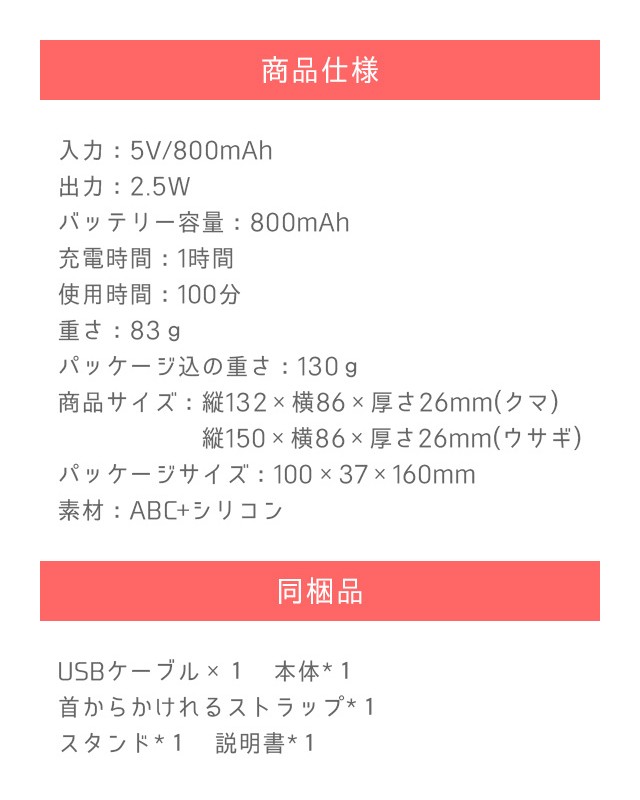 ■商品仕様入力:5V/800mAh出力:2.5Wバッテリー容量:800mAh充電時間:1時間使用時間:100分重さ:83gパッケージ込の重さ:130g商品サイズ(クマ):縦132×横86×厚さ26mm商品サイズ(ウサギ):縦150×横86×厚さ26mmパッケージサイズ:縦100×横37×厚さ160mm素材:ABC+シリコン■同封品USBケーブル×1本体×1首からかけれるストラップ×1スタンド×1説明書×1■その他携帯扇風機 ファン 小型スタンド付 ストラップ付 3段階調節 充電式 くま 熊 うさぎ しずか おしゃれ手持ち ハンディ 扇風機 おしゃれ 熱中症対策 夏 パソコン 片手持ち スマートフォンハンディファン 充電式 扇風機 かわいい 耳付き 【 ハンディ扇風機 usb iphone 充電 手持ち 首かけ 携帯 強力 小型 コンパクト コードレス 涼しい スマホ スリムファン スリム 手持ち ハンディー デスク 微風 ポータブル ミニ 持ち運び 持ち歩き 卓上 静音 可愛い 静か