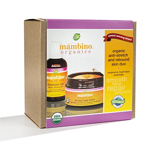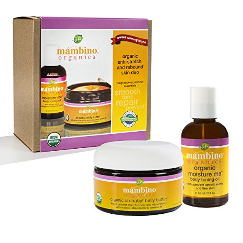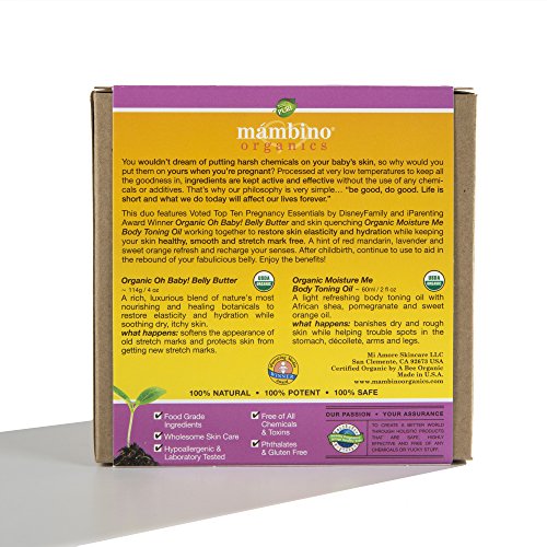 Organic Oh Baby! Belly Butter, the ORIGINAL mommy-must-have product, has become a certified phe-mom-enon! This rich, luxurious blend of nature's most nourishing and healing botanicals, softens the appearance of old and prevents new stretch marks. Restores elasticity and hydration, while soothing dry, itchy skin. A refreshing body toning oil for skin so soft and smooth. Features a powerful blend of nourishing botanical Omega oils to boost skin radiance and moisture, while firming trouble spots in the stomach, decollete, arms and legs. Also it discourages cellulite by strengthening connective skin tissue. Soothes sensitive skin, including eczema. Mambino Organics products are designed for all skin types including the most sensitive skin. Each product is made with pure, certified organic plant oils, herb and flower extracts, free from parabens, SLS or any synthetic preservatives, and free from fragrances, emulsifiers and petroleum based ingredients Cruelty Free, Gluten Free, GMO Free. At Mambino Organics, our philosophy is very simple...be good, do good. We believe the human body is an amazing gift and caring for it is our responsibility. Life is short, and what we do today will affect our lives forever. Mambino Organics produces only the highest quality products that are not only good for your skin, but are good for our planet! Package contains (1) Mambino Organics Oh Baby! Belly Butter Anti-Stretch and Rebound Skin Duo including Mambino Organics Oh Baby! Belly Butter and Mambino Organic Moisture Me Body Toning Oil.Feature