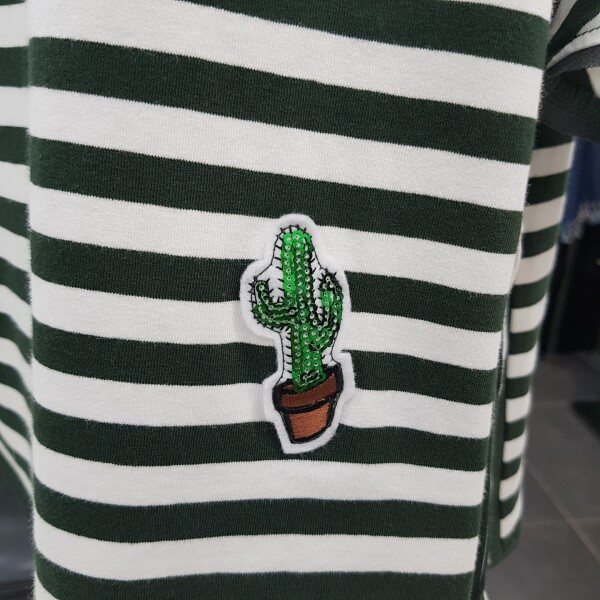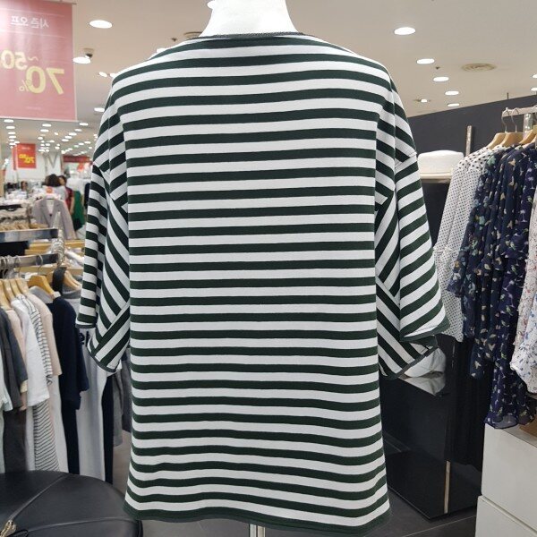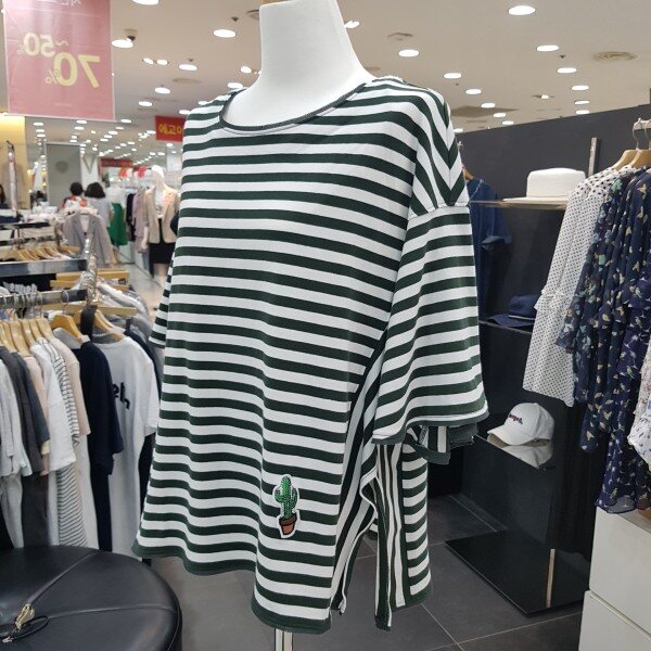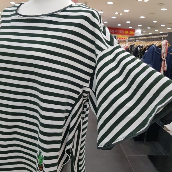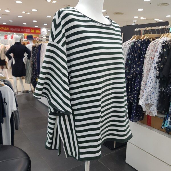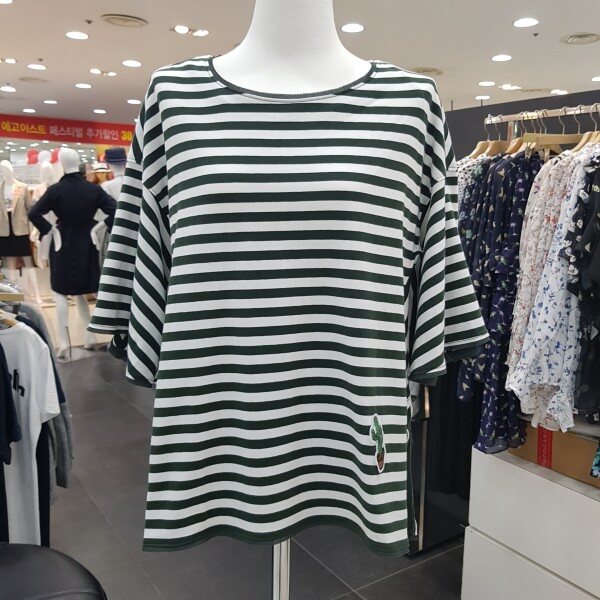 루즈핏의 사이드 슬릿 포인트가 있는 스트라이프 티셔츠 입니다러플 소매와 플레어 라인으로,체형커버에도 좋으며 목선과 소매 밑단이 쉬폰으로 테이핑 처리로 여성스러움이 더한 제품 입니다