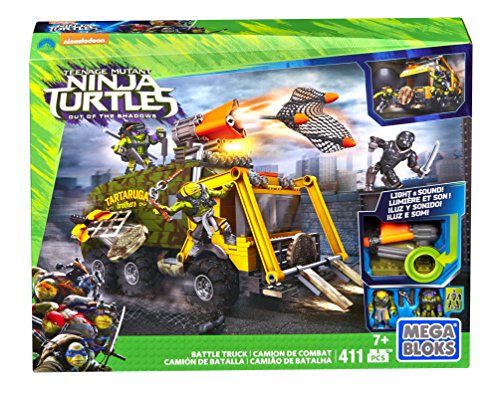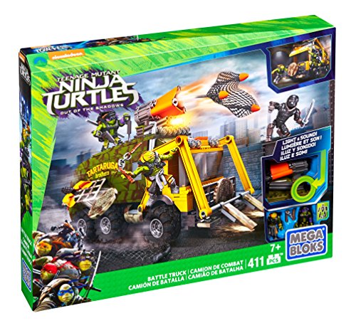 -. Binding : Toy -. Brand : Mega Bloks -. EAN : 0887961316018 -. Feature : The Turtles are taking the fight to the streets / There's no stopping Donnie and Mikey when you build their Turtle-fied assault vehicle and tear up the streets / Attack the Foot Soldier with an amazing arsenal that includes a sewer cap launcher, net launcher, and moving forklift arms / Open the roof hatch to put one of your fully articulated Turtle micro action figures in the driver's seat, while the other controls the rotating launcher with shock sensor-activated LED lights and sounds / Now you can finish off that Foot Soldier for good Connect with other Mega Bloks Teenage Mutant Ninja Turtles: Out of the Shadows sets to build your own movie-themed brawls -. IsAdultProduct : 0 -. Label : Mattel -. Manufacturer : Mattel -. Model : DPF82 -. MPN : DPF82 -. PackageQuantity : 1 -. PartNumber : DPF82 -. ProductGroup : Toy -. ProductTypeName : TOYS_AND_GAMES -. Publisher : Mattel -. ReleaseDate : 2016-04-10 -. Studio : Mattel -. Title : Mega Bloks Teenage Mutant Ninja Turtles Battle Truck Construction Set -. UPC : 887961316018 -. Warranty : 1 year warranty against manufacturer defects