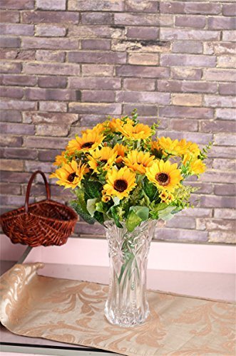 Product specification: The effect picture shown on the main page is 2 bunches of flowers, 7 stems 4 flowers per bunch. 2 bunches per pack. 8 big sunflowers and 18 small sunflowers and 21 leaves in all. The total length is 12 inch, the dianeter of big sunflower is 4 inch