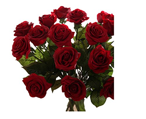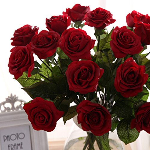 YUAN Decor Rose Artificial Flowers Silk Flowers Floral Latex Real Touch Rose Wedding Bouquet (10PCS, Dark Red)
