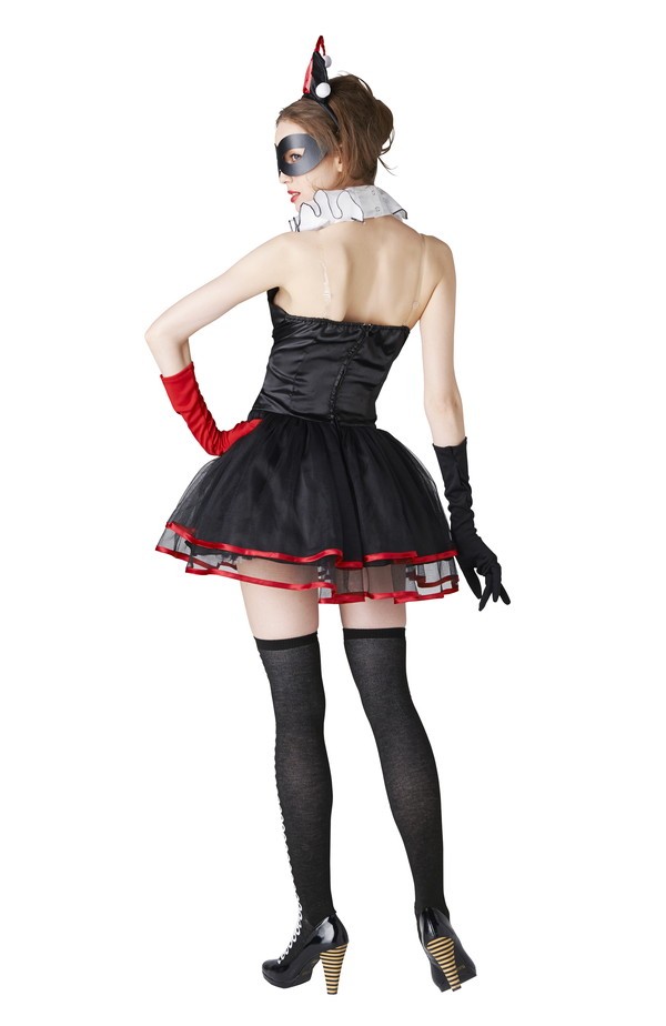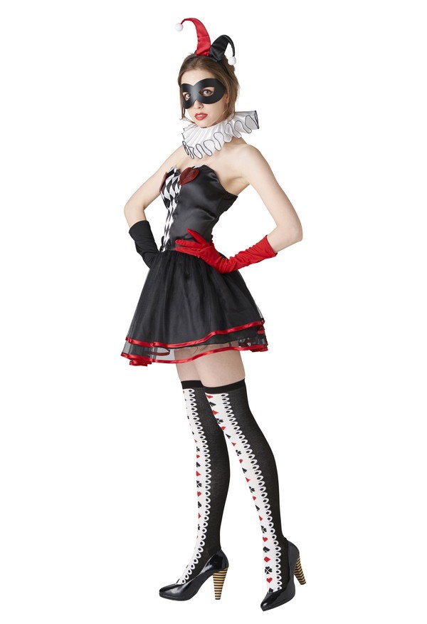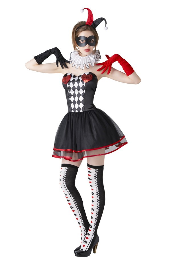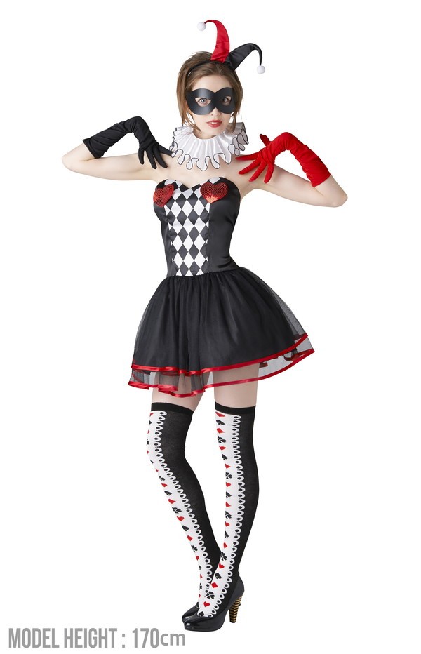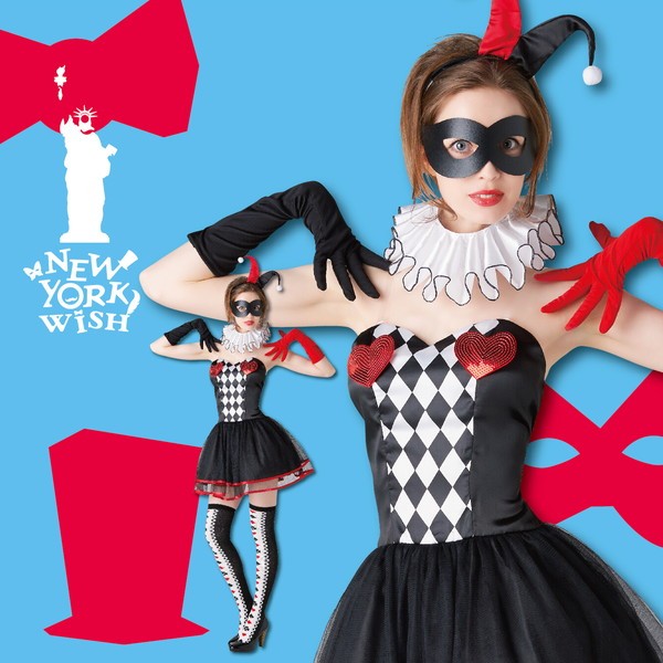 アイマスクとボリューミーな付け襟がエキゾチックな印象のジョーカーコスチューム☆チェック生地やスパンコールのハートが豪華なデザインです!左右色違いのグローブもポイント。様々な着こなしができる充実のセット内容♪