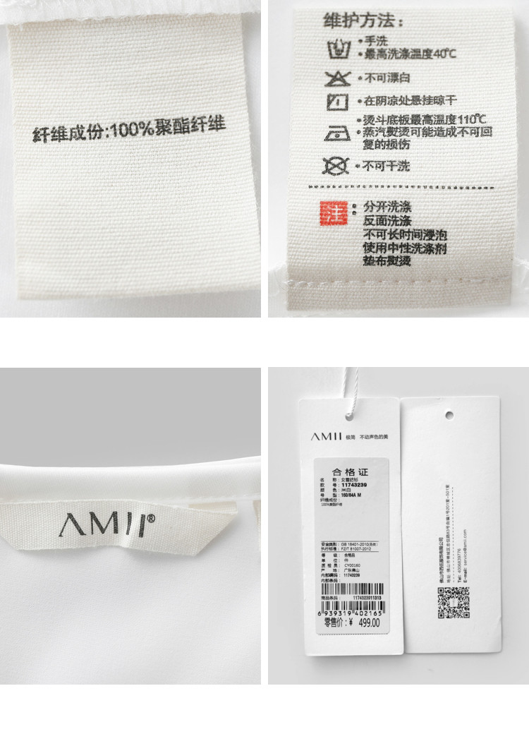 | 洗涤标准: | 不可干洗悬挂晾干不可漂白40℃以下手洗110℃以下垫布熨烫不可浸泡 |