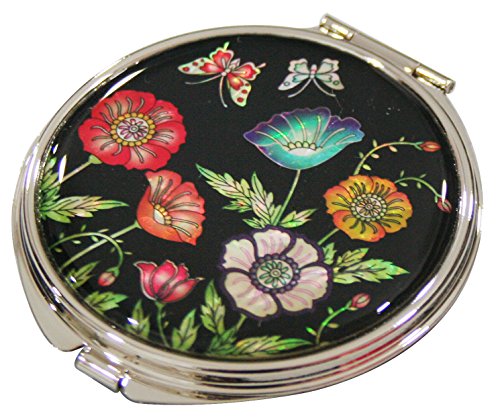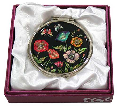 Handmade Handcrafted Mother of Pearl Magnifying Double Compact Cosmetic Makeup Round Hand Mirror lacquer wares inlaid with Opium Poppy Design